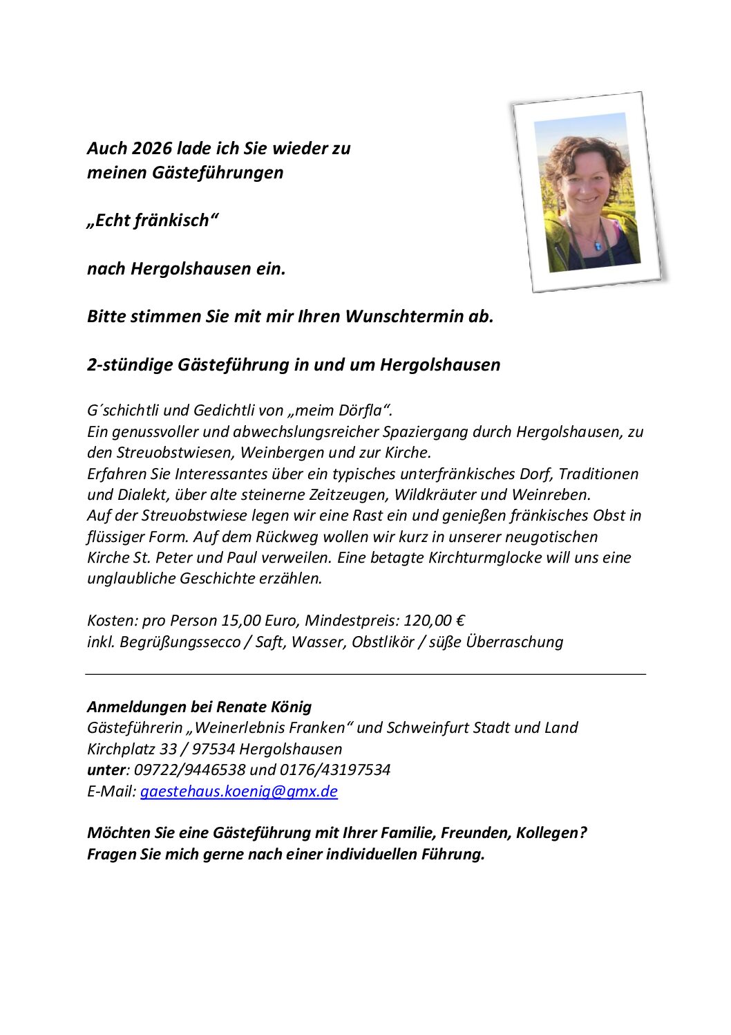 Neben der klassischen Altstadtführung in Schweinfurt bietet Renate auch eine besondere Führung in Hergolshausen an – mit Geschichte und Gschichtli zu „unerm Dörfla und unerm Kirchla“ z. B. unter dem Motto Hergolshausen am „Dicken Tag“ – Peter & Paul.